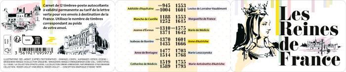 Dieses Heftchen mit 12 Briefmarken beleuchtet mehrere Königinnen, die die Geschichte Frankreichs geprägt haben. Zu sehen sind Adelheid von Aquitanien, Anna von Österreich, Anna von der Bretagne, Blanche von Kastilien, Katharina von Medici, Isabeau von Bayern, Jeanne d'Évreux, Louise von Lothringen, Marguerite von Frankreich, Maria von Medici, Maria Leszczynska und Marie Antoinette. Eine Sammlung von Porträts, die Jahrhunderte des königlichen Lebens nachzeichnet.