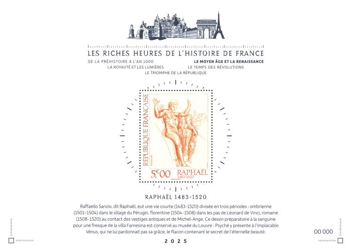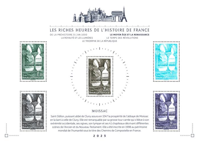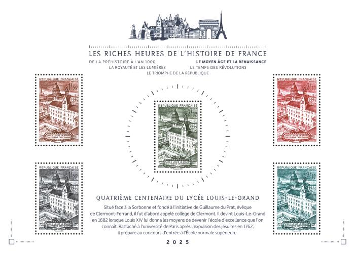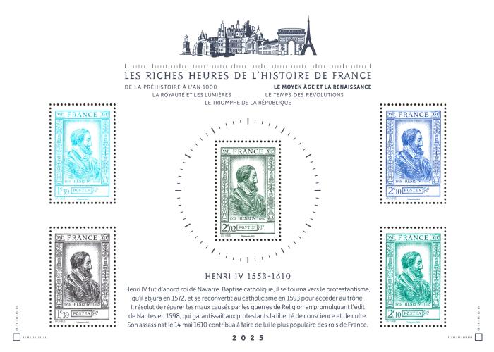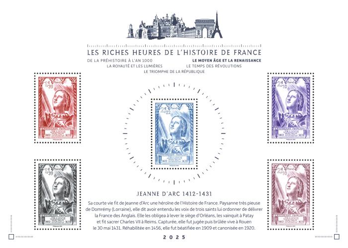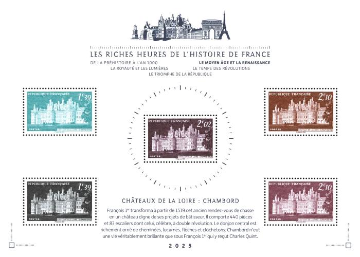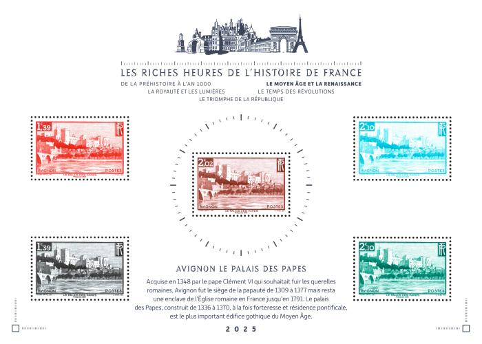 Dieses 2. Set, das 2025 unter dem Titel "Vom Mittelalter zur Renaissance" ausgegeben wurde, besteht aus 10 Bögen zu je 5 Briefmarken und einem 11. Geschenkbogen, der wie folgt zusammengesetzt ist - Briefmarke Philippe Auguste 1165-1223, 26 x 40 mm, (Ausgabedatum: 1955) - YT 1027 - Briefmarke Avignon Le palais des papes, 36 x 21 mm, (Ausgabedatum: 1938) - YT 391 - Briefmarke Bayard 1473-1524, 26 x 40 mm, (Ausgabedatum: 1943) - YT 590 - Briefmarke Moissac, 26 x 40 mm, (Ausgabedatum 1963) - YT 1394 - Briefmarke Jeanne d'Arc 1412-1431, 26 x 40 mm, (Ausgabedatum: 1946) - YT 768 - Briefmarke Ludwig XI, Schöpfer der Staatspost, 40 x 26 mm, (Ausgabedatum: 1945) - Briefmarke Henri IV, 26 x 40 mm, (Ausgabedatum: 1943) - Briefmarke François Rabelais, 26 x 40 mm, (Ausgabedatum: 1950) - Briefmarke Chambord, Châteaux de la Loire, 40 x 26 mm, (Ausgabedatum 1952) - Briefmarke 4e centenaire du lycée Louis Le Grand, 26 x 40 mm, (Ausgabedatum 1963). - Briefmarke Raphael 1483-1520, 40,85 x 52 mm, (Ausgabedatum 1983) Die nächsten Jahre werden in chronologischer Reihenfolge den folgenden Themen gewidmet sein: - Das Königtum und die Aufklärung - Die Zeit der Revolutionen, - Der Triumph der Republik