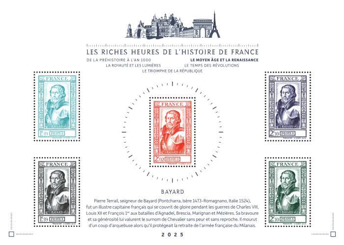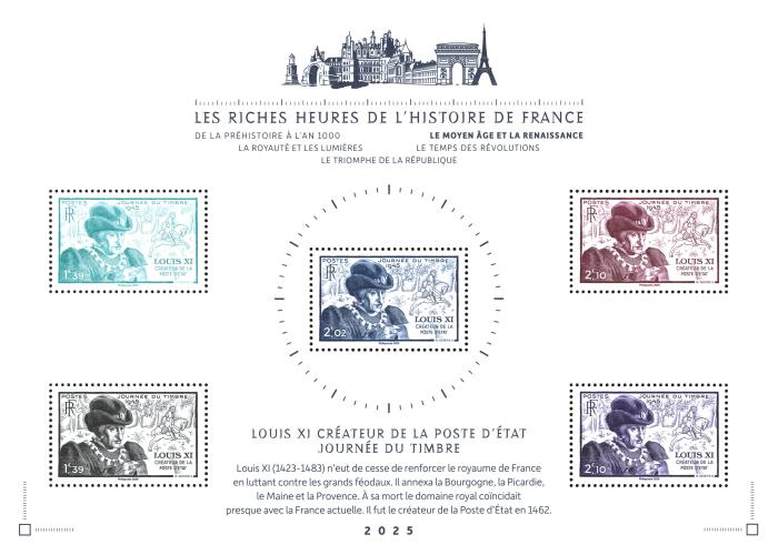 - Timbre Philippe Auguste 1165-1223, dessiné par Louis Charles Muller, gravé par Pierre Munier - Timbre Avignon, le palais des papes, dessiné par André Spitz, gravé par Jules Piel - Timbre Bayard 1473-1524, dessiné et gravé par Raoul Serres - Timbre Moissac, dessiné par André Spitz, gravé par Charles Mazelin - Timbre Jeanne d'Arc 1412-1431, dessiné et gravé par Albert Decaris, © Adagp, Paris 2025 - Timbre Journée du timbre 1945, Louis XI, créateur de la Poste d'Etat, dessiné et gravé par Raoul Serres - Timbre Henri IV, dessiné et gravé par Achille Ouvré, - Timbre François Rabelais, dessiné et gravé par Albert Decaris d'après une oeuvre de Léonard Gastien, © Adagp, Paris 2025 - Timbre Chambord-Châteaux de la Loire, dessiné et gravé par Pierre Gandon - Timbre 4e centenaire du lycée Louis Le Grand, dessiné et gravé par Claude Hertenberger - Timbre Raphaël 1483-1520, dessiné et gravé par Claude Haley © Musée de La Poste, Paris La Poste 2025 Conception graphique et logo : création Patte & Besset