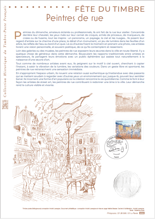 Im Rahmen des Briefmarkenfests illustriert die Straßenkunst in diesem Jahr 2026 auf der Briefmarke die Straßenmaler. "Sonntagsmaler, aufgeklärte Amateure oder Profis, sie haben die Straße zu ihrem Atelier gemacht. Konzentriert hinter ihrer Staffelei, die Augen auf ihr Skizzenbuch gerichtet, mit Pinsel, Filzstift, Kreide oder Kohle bewaffnet, inspiriert sie alles: ein Panorama, eine Landschaft, der Himmel und die Wolken? Sie richten ihren künstlerischen Blick auf den Charme eines Platzes, das Detail eines Monuments, das Lichtspiel in den Blättern eines Baumes, die Reflexionen des Wassers am Ufer eines Kais. Wo andere den Moment festhalten, indem sie ein Foto machen, liefern diese Künstler eine persönliche und oft poetische Vision dessen, was sie betrachten und empfinden. Fernab von Galerien oder Museen stellen die Straßenmaler ihre Werke in aller Freiheit in der Stadt aus. Dieser Ansatz hat etwas Großzügiges an sich. Sie stellen die traditionellen Beziehungen zwischen Künstlern und Zuschauern auf den Kopf und teilen ihre Emotionen mit einem flüchtigen Publikum, das ganz natürlich die Entstehung eines Kunstwerks miterlebt. Wie viele Künstler vor ihnen malen sie auf dem Motiv unter freiem Himmel und versuchen, den Augenblick einzufangen, die Vibration des Lichts und die Variationen der Farben zu erfassen. Mit einer freien und spontanen Geste geben die Straßenmaler ein unmittelbares Gefühl wieder. Indem sie sich den städtischen Raum aneignen, bauen sie eine ebenso authentische wie unerwartete Beziehung zu den Passanten auf, die plötzlich beginnen, eine Umgebung, die ihnen bis dahin vielleicht banal erschien, mit anderen Augen zu betrachten. Sie verkörpern eine Form der Volkskunst, bei der das kreative Schaffen auf das Alltagsleben trifft. Wie Street-Art-Künstler auf ihre Weise, tragen auch Straßenmaler dazu bei, der Stadt wieder eine Seele zu geben. Ihre Vorgehensweise macht die Kultur sichtbar und lebendig". Redakteurin: Fabienne Azire