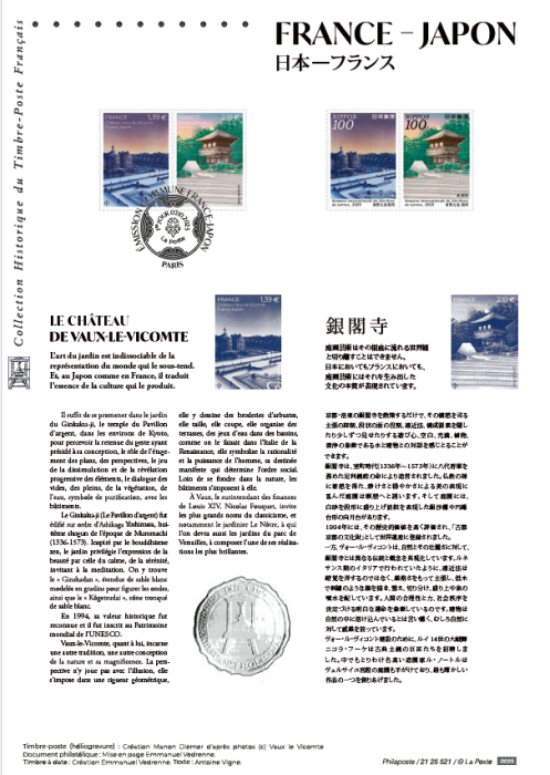 Timbres (offset) : Création Manon Diemer d’après photos : Le château de Vaux-le-Vicomte © Château de Vaux-le-Vicomte. Document philatélique : Mise en page Emmanuel Vedrenne. Texte : Antoine Vigne.