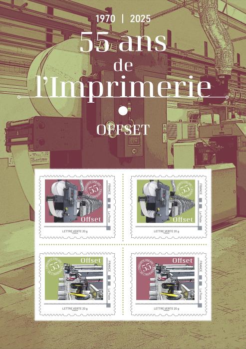 En 1970 se creó la imprenta de sellos de Périgueux (24). Desde entonces, se ha utilizado una amplia gama de técnicas de impresión específicas y máquinas históricas y modernas para fabricar productos filatélicos y de seguridad. Con motivo del 55º aniversario de la Imprimerie, una serie de 4 coleccionistas ilustra las máquinas históricas y modernas y las 4 técnicas de impresión utilizadas en la imprenta de sellos postales de Boulazac (24). Este segundo coleccionable ilustra la impresión offset. La impresión offset debutó en la imprenta de Boulazac en 1987 con el sello conmemorativo de la llegada al poder de Hugues Capet en 987. Se trata de un proceso de impresión fotomecánica sin calcografía ni relieve. El proceso offset hizo su aparición en la década de 1980. Su éxito se debe a su flexibilidad y a su capacidad para adaptarse a una gran variedad de productos. La imagen se graba primero con un láser mediante un ordenador a plancha (CTP). A continuación se traduce en una trama (puntos de diferentes tamaños) sobre una plancha de aluminio fotosensible (tantas planchas como colores). La calidad de la imagen impresa viene determinada por la proximidad de los puntos. En la máquina, las partes entintadas de la plancha se transfieren al papel. Para obtener la imagen impresa, el operador de offset marca los distintos colores y ajusta la densidad del entintado. Sellos - Máquina offset de bobina DG Press 2023, 7 colores. - Offset de pliegos Man Roland 2013, 6 cuerpos de impresión.