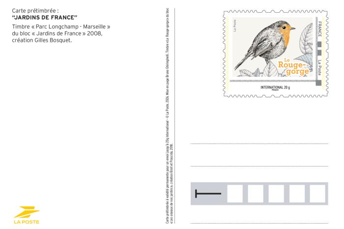 Carte prétimbrée "Parc Longchamp - Marseille", timbre dessiné par Gilles Bosquet, 2008 et timbre "Le Rouge-gorge" 2018, dessiné par Broll & Prascida (c) La Poste, 2026.