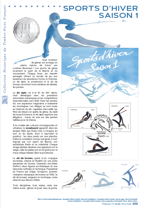 Bloc et Timbre-poste (Héliogravure) : conception Michel Canetti. Document philatélique : Conception Michel Canetti, mise en page : Bruno Ghiringhelli. Cachet d’oblitération : Conception Michel Canetti, mise en page Bruno Ghiringhelli. Texte : Myriam Alizon.
