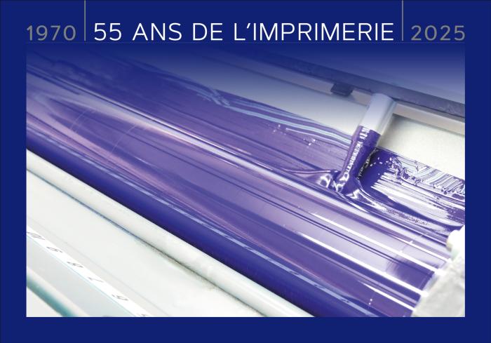 オフセット・マシンの青いインク壺が描かれたこのカードを含め、創立55周年を記念して2種類のプレ・スタンプ・カードが発行された。
