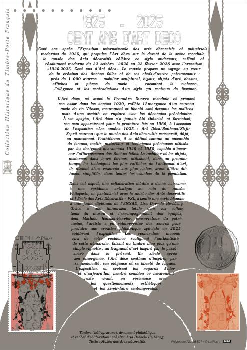 Timbre (héliogravure), document philatélique et cachet d'oblitération : création Lisa Derocle Ho-Léong. Texte : Musée des Arts Décoratifs.