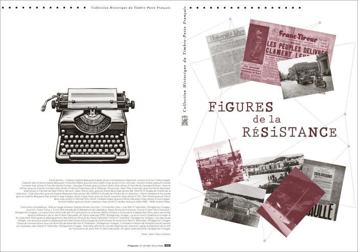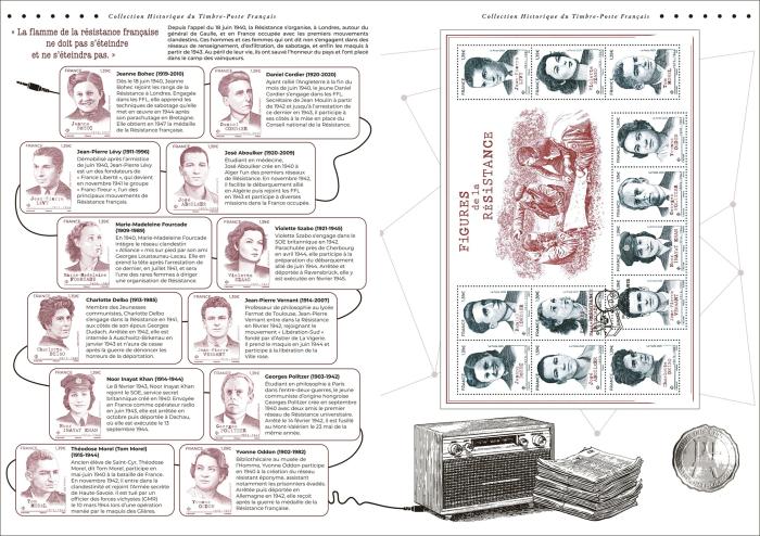 Création Sophie Beaujard - Fond de bloc: Combattants résistants, Hu Iton Archive/ Gettyimages. Création des timbres Sophie Beaujard, Charlotte Delbo gravure Elsa Catelin d'ap. photo© Eric Schwab; Daniel Cordier gravure Claude Jumelet d'ap. photo© Famille Daniel Cordier; Georges Politzer gravure Elsa Catelin d'ap. photo© Famille de Georges Politzer; Jeanne Bohec gravure Claude Jumelet d'ap. photo© Service historique de la Défense, Vincennces; Jean-Pierre Vernant gravure Pierre Al buisson d'ap. photo© Famille de Jean-Pierre Vernant; Jean-Pierre Levy, gravure Pierre Bara d'ap. photo Réf. 004772. © Musée de l'Ordre de la Libération; José Aboulker gravure Sophie Beaujard d'ap. photo Ref. 000070 © Musée de l'Ordre de la Libération; Marie-Madeleine Fourcarde gravure Sophie Beaujard d'ap. photo© a kg-images; Noor lnayat Khan gravure Sarah Lazarevic d'ap. photo© DR; Tom Morel gravure Pierre Bara d'ap. photo© Famille Tom Morel; Violette Szabo gravure Pierre Al buisson d'ap. photo© Auri mages; Yvonne Oddon gravure Sarah Lazarevic d'ap. photo© Studio Harcourt (7934-7997) - RMN-Grand Palais. Document philatélique: Mise en page Arobace d'après photos ci-dessous: Journal« L'Université Libre», mai 7947 © Tal landier/ Bridge man Images; Journal« Franc-Tireur», 9 mai 794S © Jean-Paul Paireault / Bridgeman Images; Le corps Franc Pommies des FFI participant au premier défilé militaire à Toulouse le 3 septembre 7944, deux semaines après la libération de la ville© Jean Dieuzaide. Ali rights reserved 202S / Bridgeman Images; Le sous-marin Casabianca à Alger le 30 novembre 7942 après le débarquement des Alliés en Afrique du Nord (Opération Torch) © Tal landier/ Bridgeman Images; Vue des quais d'Alger, une semaine après le débarquement des forces britanniques et américaines, 76 novembre 7942 © Granger / Bridgeman Images; Camp de concentration pour les femmes de Ravensbruck © Tal landier/ Bridgeman Images; Cimetière militaire de Morette (Haute Savoie) sur le plateau des Glières© Tal landier/ Bridgeman Images; Première affiche du comité régional de Libération, après la libération de la ville de Toulouse le 20 août 7944 © Jean Dieuzaide. Ali rights reserved 202S / Bridgeman Images. Texte : Jean-Yves Le Naour