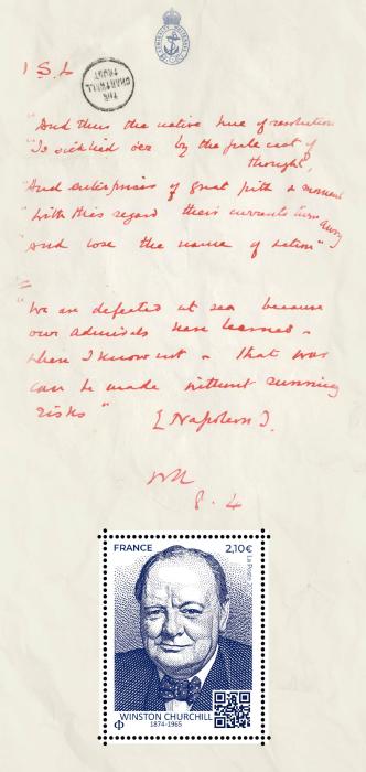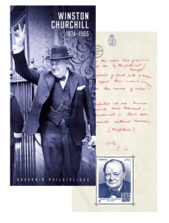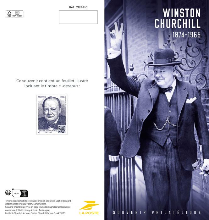 Timbre-poste (taille-douce): création et gravure Sophie Beaujard d’après photo © Yousuf Karsh / Camera Press. Souvenir philatélique: mise en page Bruno Ghiringhelli d’après photos ; couverture© World History Archive / Aurimages ; feuillet© Churchill Archives Centre, Churchill Papers, CHAR 13/57/3