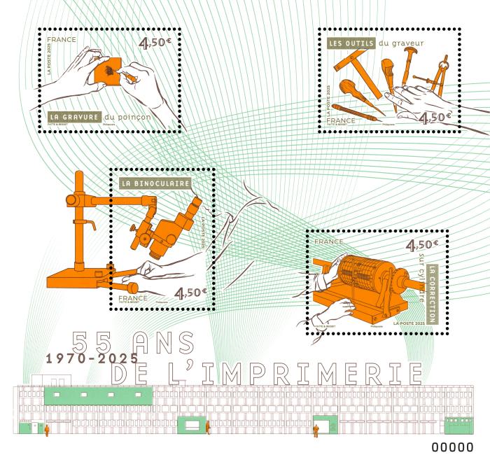 To mark the 55th anniversary of the printing works, a block of 4 stamps recalls the gestures of engraving. At the bottom, a stylized printing press in architect's drawing mode, from which scrolls escape like so many engraving strokes.