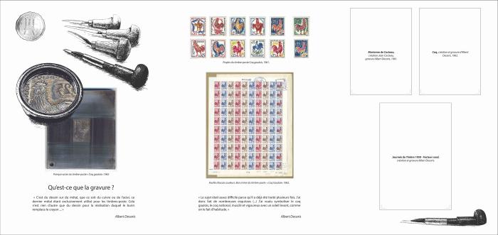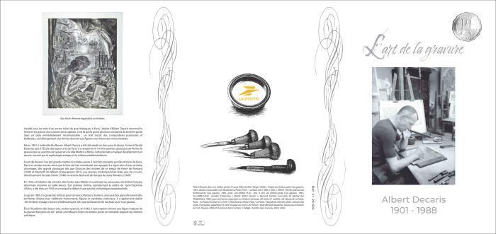 This booklet is a tribute to engraver Albert Decaris (1901-1988) through a selection of stamps reproduced in blocks of 4 and illustrating some of the artist's work. To cover his entire output for the French postal service (excluding service stamps), a list of the postage stamps he produced (on a separate titled sheet) is also included in the booklet. The graphic design and layout were created by Line Filhon, also a stamp engraver for the French Post Office.
