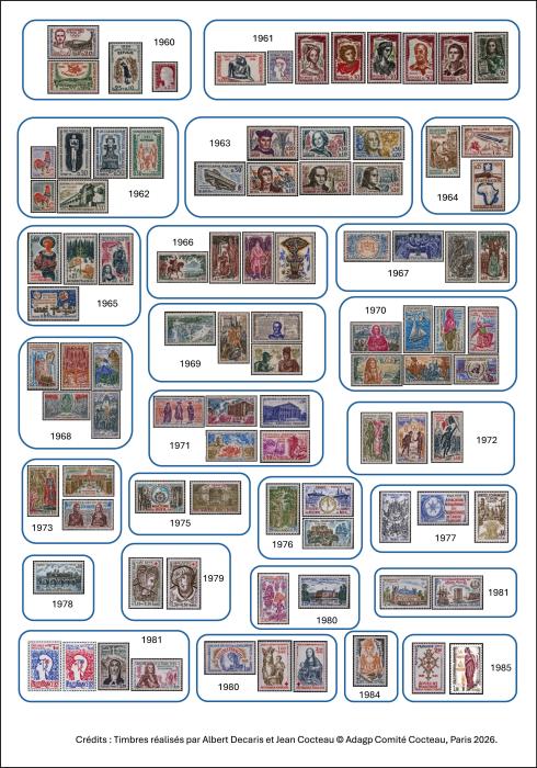 conception graphique et mise en page du livret Line Filhon ; Albert Decaris dans son atelier, photo © Laure Albin Guillot / Roger-Viollet ; Projets du timbre-poste Coq gaulois, 1961, dessin et aquarelle, coll. Musée de La Poste, Paris – La Poste (inv.17666, 17667, 17669 à 17678), poinçon du timbre-poste Coq gaulois, 1962, acier, (inv.2008.0.15.6) bon à tirer du timbre-poste Coq gaulois, 1962, (inv.2009.0.452) ; extraits d’interview « Maître Albert Decaris », Bernard Gontier, hors-série du Monde des Philatélistes, 1988 ; gravure Femme regardant un timbre à la loupe, 20e siècle (2e moitié), coll. Musée de La Poste, Paris – La Poste (inv.2007.0.13.199) © Musée de La Poste, Paris / La Poste / Tous droits réservés, 2025 ; texte Monika Nowacka, Docteure en histoire de l’art ; Œuvres de Jean Cocteau et d’Albert Decaris © Adagp/Comité Cocteau, Paris, 2026.