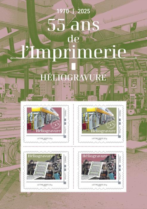 In 1970, the stamp printing plant was set up in Périgueux (24). Since then, a host of specific printing techniques and historic and modern machines have been put to work for philately and secure products. To mark the Imprimerie's 55th anniversary, a series of 4 collectors illustrates the historical and modern machines and 4 printing techniques used at the Boulazac (24) stamp printing works. This collector illustrates the rotogravure technique. This printing technique is appreciated for its dense, vivid color quality. It can also be used to process images containing flat areas of color, as seen in contemporary works of art. As with intaglio printing, only the hollows are printed. The original visual is obtained by superimposing the four basic colors (cyan, magenta, yellow and black), one cylinder per color and water-based ink. The visual is imposed and engraved on cylinders using an electromechanical bench. Mounted on rotary presses during the printing process, these rollers are dipped into the ink: the hollowed-out cells are filled with ink, the surplus is removed by a doctor blade, the paper is brought into contact with the cylinder and the ink is deposited. In this way, the superimposition of the four primary colors restores the original design. The latest Rotomec gravure press can print up to 10 colors on both sides. Stamps - Rotomec rotogravure press installed in 2006, 10 printing units on both sides. - Printing a sheet of stamps on a 6-color Chambon press, acquired in 1964.