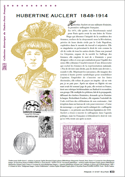 Timbre-poste (taille-douce) : création et gravure Sophie Beaujard d'après photos Bibliothèque Marguerite Durand, Paris, France © Leonard de Selva/Bridgeman Images, © Keystone France/GAMMA RAPHO, © Xosé Bouzas / HANS LUCAS. Document philatélique : création Sophie Beaujard d’après photos Bibliothèque Marguerite Durand, Paris, France © Leonard de Selva/Bridgeman Images, « vignette philatélique dessinée par L.Mangin et gravée par H.Wullschleger, 1906 » © Leonard de Selva / Bridgeman Images. Cachet d’oblitération : création Sophie Beaujard d’après photo © Keystone France/GAMMA RAPHO. Texte : Nicole Cadène.